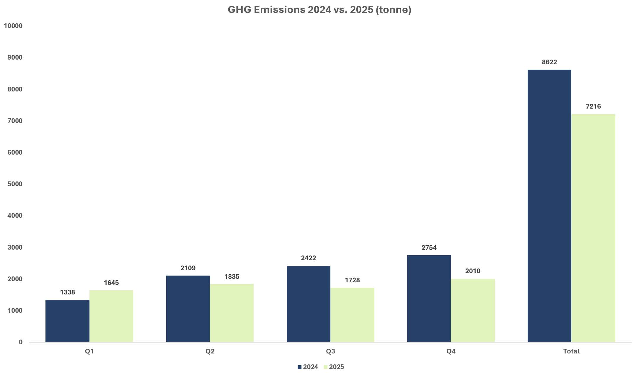 Utviklingen gjennom året viser varierende resultater per kvartal. Utslippene økte i Q1 2025 sammenlignet med samme periode i 2024, men ble deretter betydelig redusert i Q2, Q3 og Q4, med særlig sterke reduksjoner i andre halvår. Sammenlignet med 2024 ble utslippene redusert med 13,0 % i Q2, 28,7 % i Q3 og 27,0 % i Q4.
